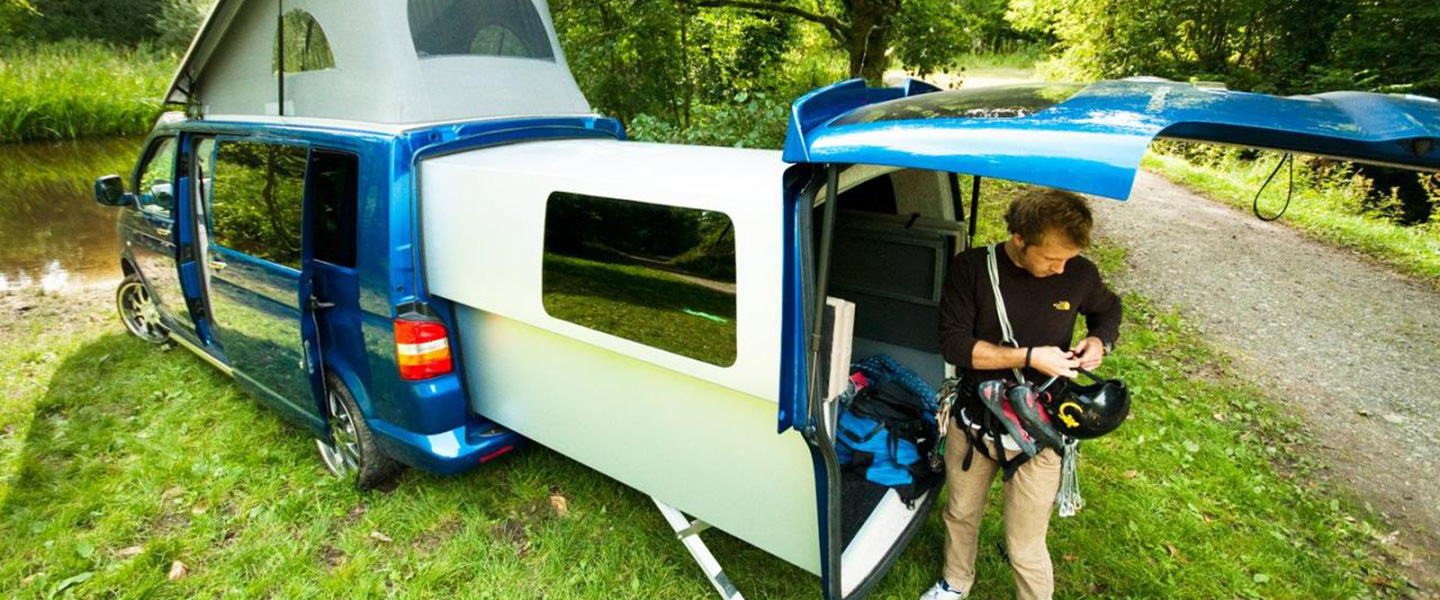 Het is eigenlijk geleden van de Volkswagen T1 en T2 dat deze minibusjes werden omgebouwd tot kleine kampeerwagens. Al ging de uitbouw nooit zover als wat ze bij Danbury nu gedaan hebben met deze T5. Deze Doubleback heeft een 2 meter elektrisch uitschuifbaar verlengstuk waardoor de leefruimte in het minibusje wel heel groot wordt. Zo krijg je 3-4 bedden, een zithoek met tafel, klein keukentje met lavabo en ijskast en kan je zeker met 2 volwassen goed op reis. Je kan meer dan 2 mensen te slapen leggen, maar aangezien er maar 2 stoelen zijn vooraan kan je eerlijk gezegd niet met meer dan 2 op stap.